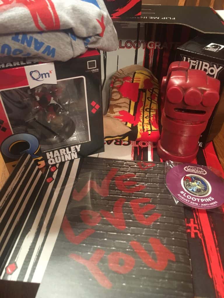 This is August 2016 Anti-Hero theme crate. This box features: A Harley Quinn figure(also called a Q-Fig), An Archer T-Shirt, Hellboy Coin Bank and a pair of Kill Bill socks (Photo from lootcrate.com)