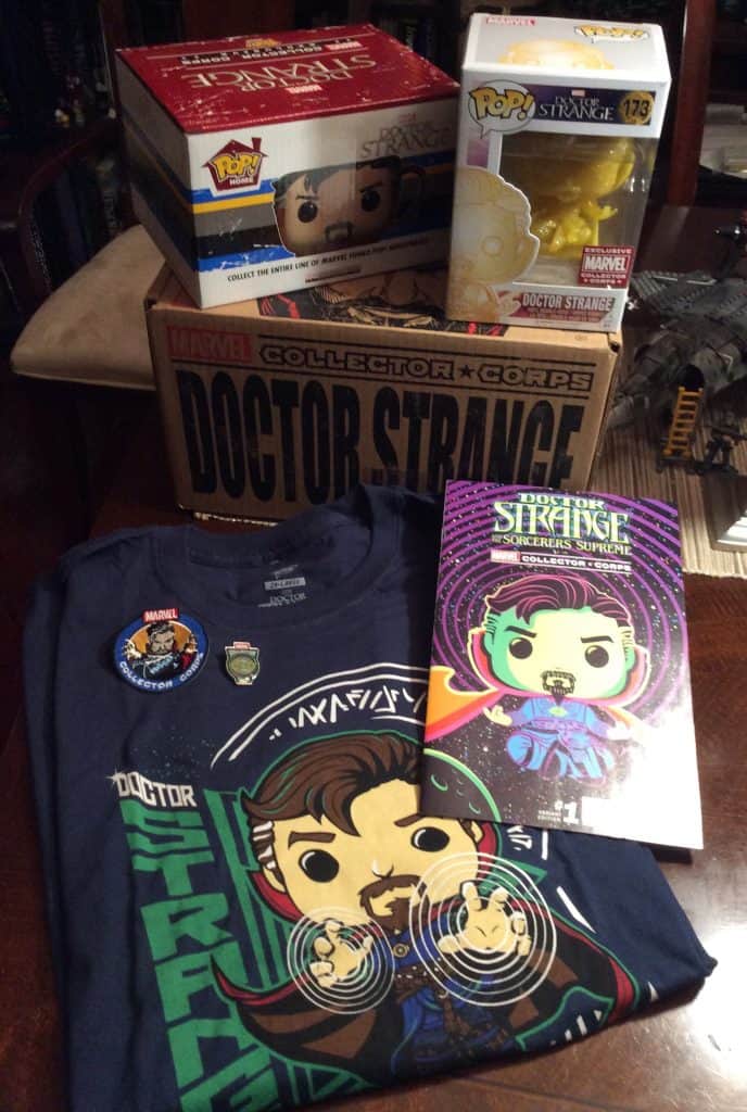 This is November 2016 Magical theme crate. Inside this box is Doctor Strange Q-Fig, (note: not all boxes come with Q-figs) Fantastic Beast tee shirt, Game of Thrones journal and Big Trouble in Little China Comic. (Photo from lootcrate.com).