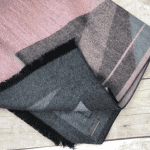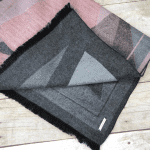 The front of the scarf incorporates light grey, medium grey, and dark grey in a geometric pattern, that’s bunched closer together than the pattern on the back. The pattern on the back of the scarf includes light rose, medium rose, light grey, and medium grey. The geometric pattern on the back of the scarf is much larger and isn’t as tightly packed together. Personally, I love the pattern on the back of the scarf because I’m such a huge fan of pink and grey together!