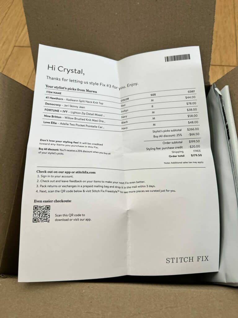 The box also included the bag to ship any items that didn’t work back to them and the invoice that showed the price for each item, styling fee, and a potential discount.