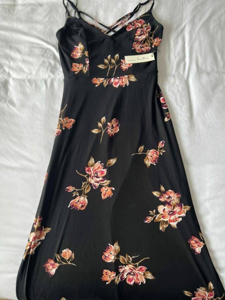 This was a no-brainer “yes” when I saw the preview. I love the strappy back on this one, and I believe the stylist chose this because I said I like small patterns or, if the pattern is large, I like it more spread across a solid background. It’s weighty, so I don’t see this getting wrinkled easily. It seems like it’ll be easy to toss on, layer in different seasons, and care for.
